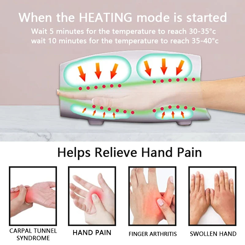 המכשיר מצויד בשני מצבי עיסוי ושלוש רמות עוצמה, מה שמאפשר התאמה אישית מלאה לצרכים שלכם. עם שילוב ייחודי של אוויר דחוס וחימום עדין, הוא מרגיע את כפות הידיים, מפחית כאבים ומשחרר מתחים. תכונות אלו הופכות את העיסוי לחוויה מרגיעה ונעימה שמותאמת בדיוק לרצונות שלכם